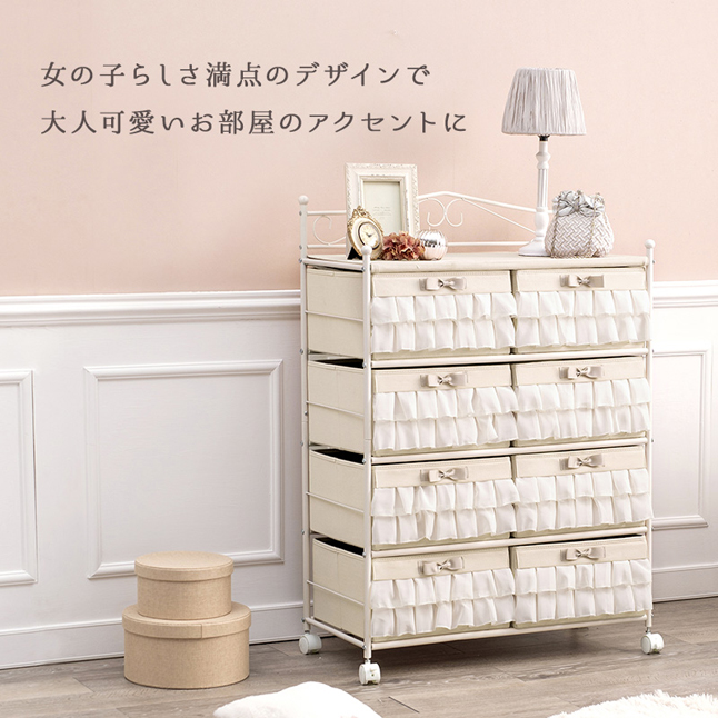 チェスト 白 スチール ボックス収納 8杯 幅76 リボン プリンセス 可愛い 引き出し ホワイト家具 キャスター付き