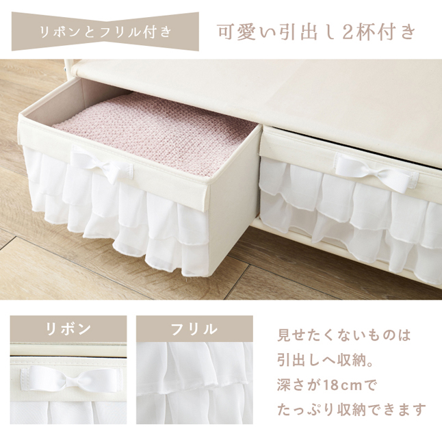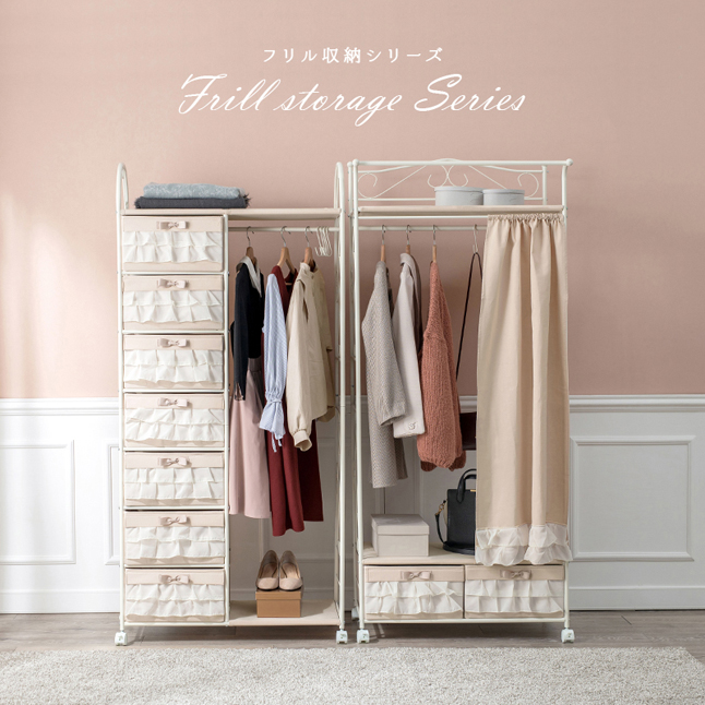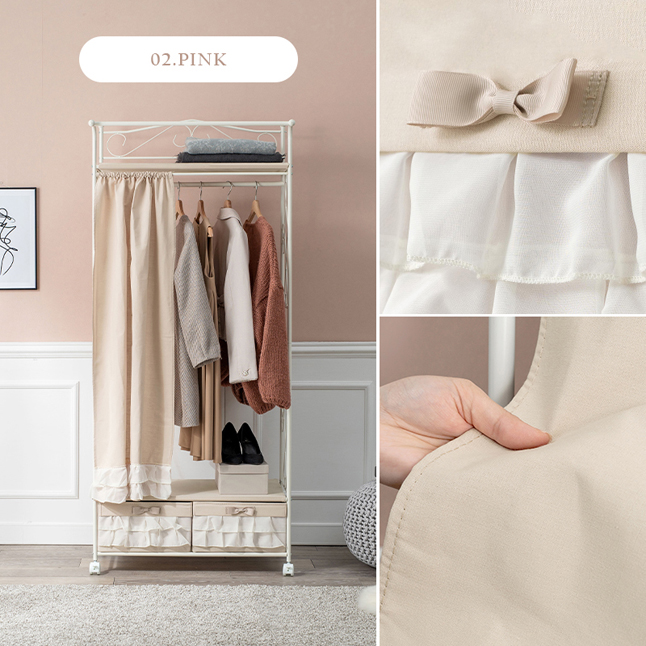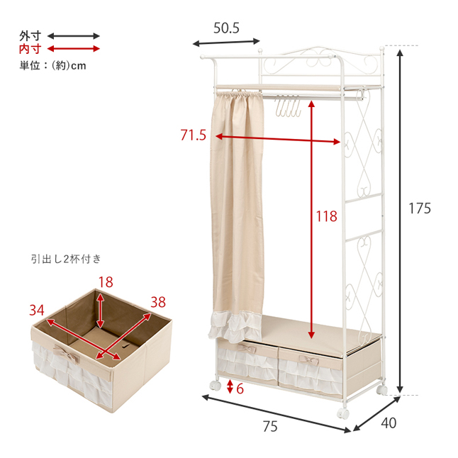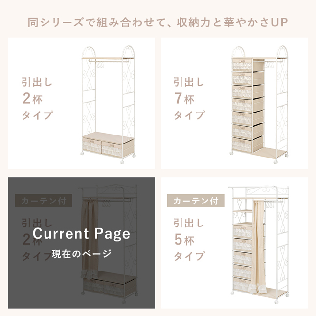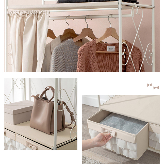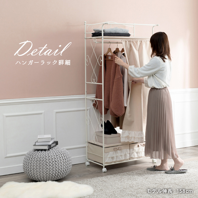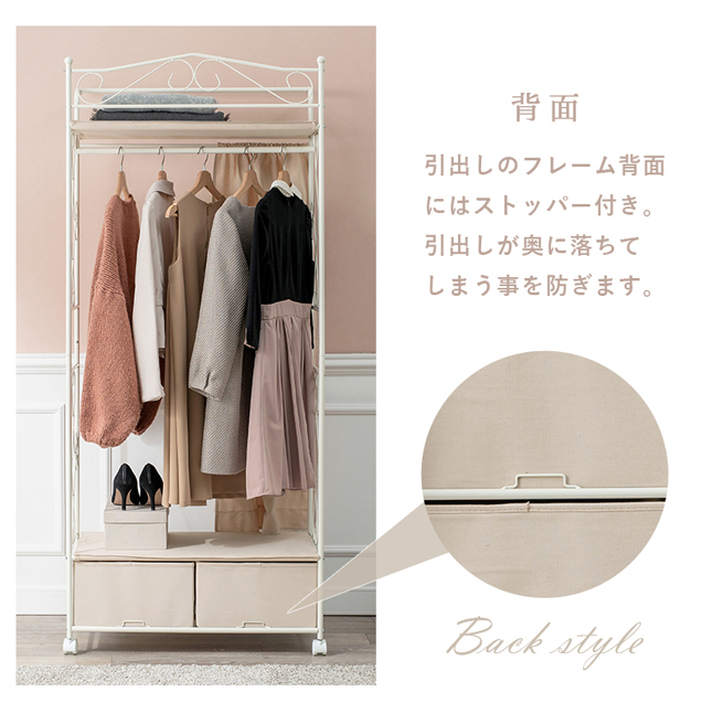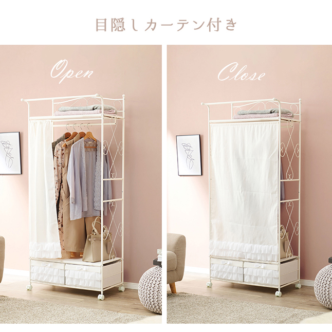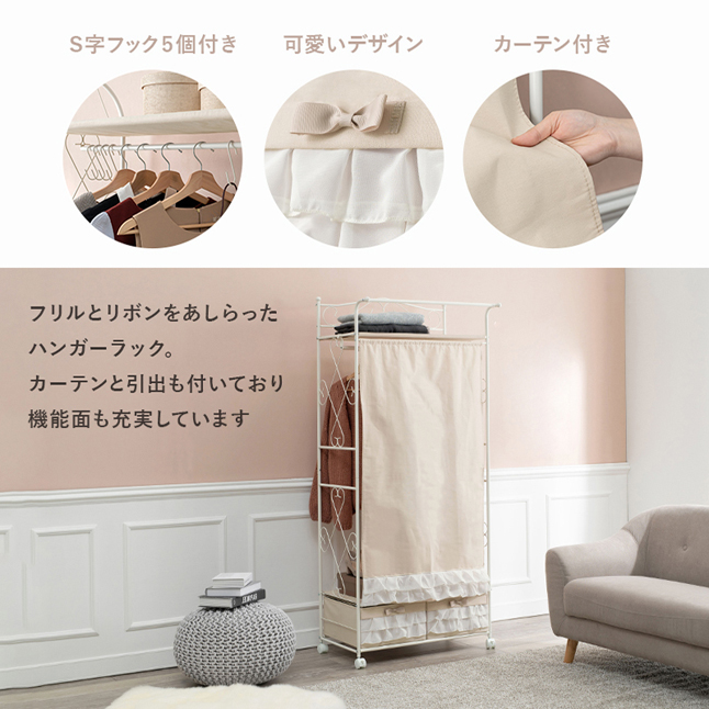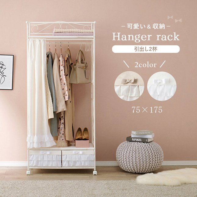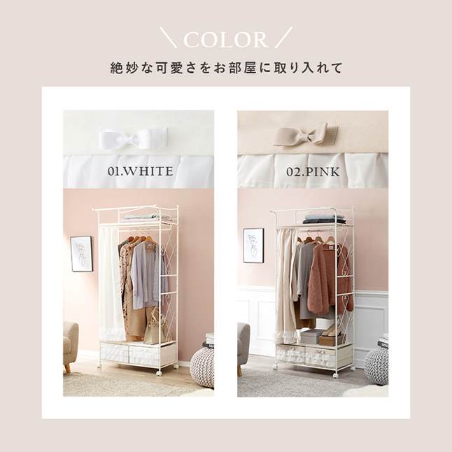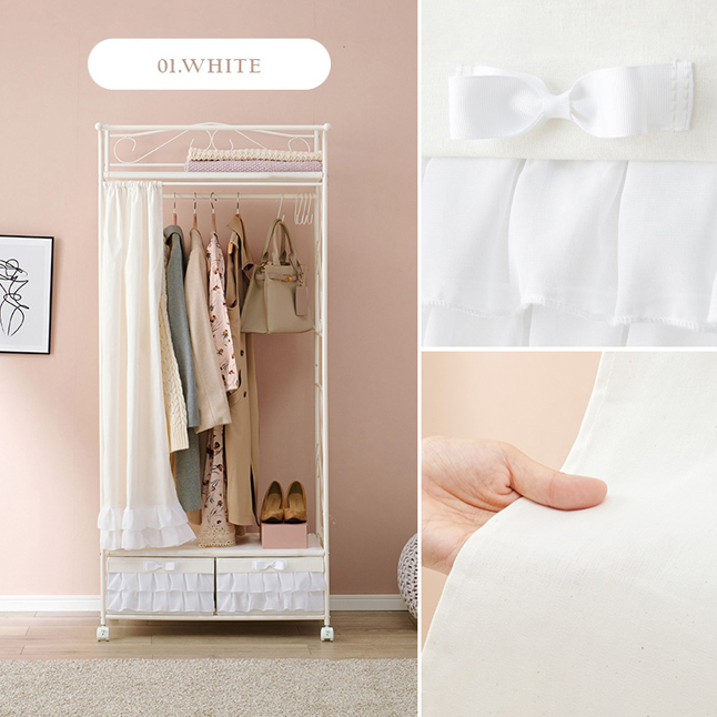 ハンガーラック 白 スチール 収納 おしゃれ 幅75 リボン プリンセス 可愛い 引き出し ホワイト家具 ガーリー キャスター付き