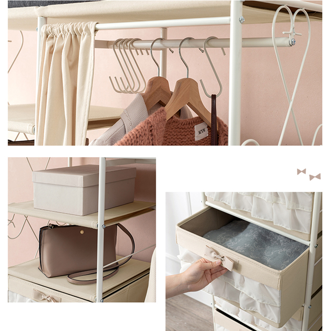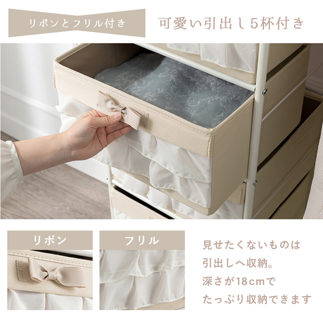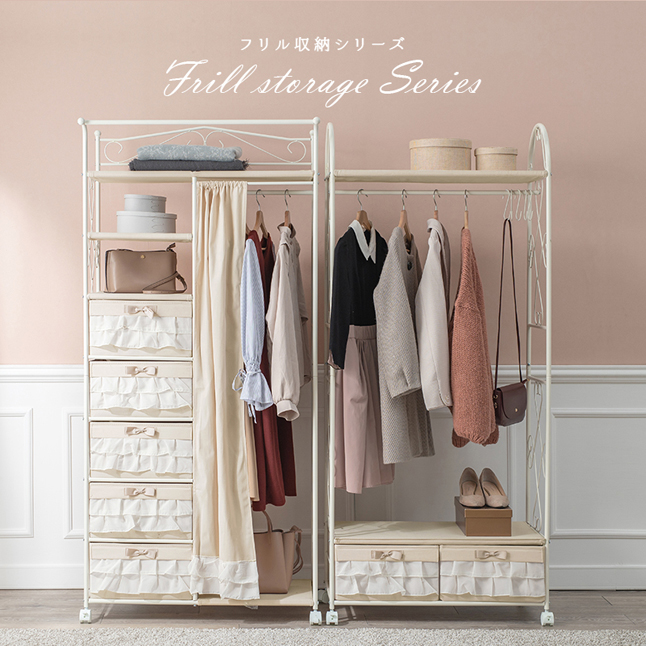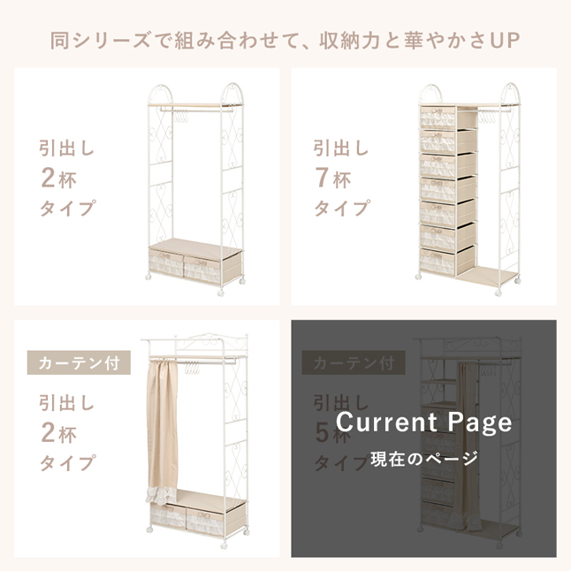 ハンガーラック 白 スチール ボックス収納 おしゃれ 幅80 リボン プリンセス 可愛い 引き出し ホワイト家具 キャスター付き