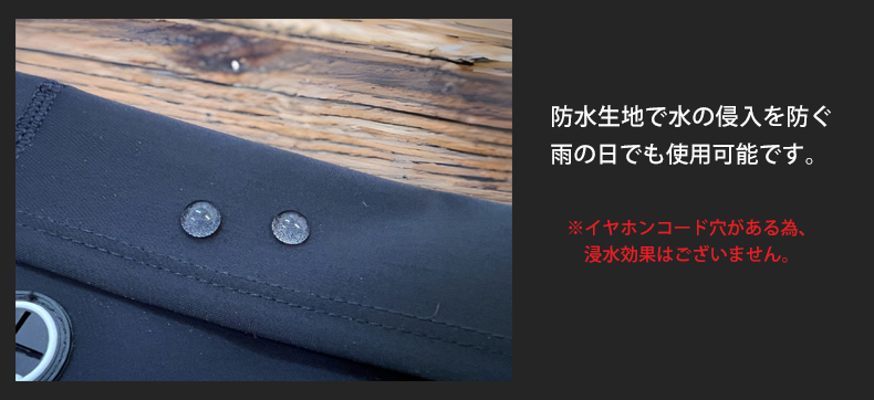 ポリエステル素材で防水効果有り。サーフィンのウエットスーツに近い素材感。(※イヤホンの穴用のがある為、浸水効果はございません)