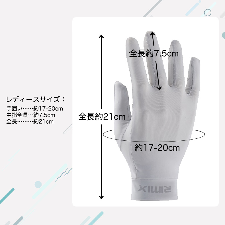 ・Fサイズ (レディースサイズ)手囲い:約17-20cm 中指全長:約7.5cm 全長:約21cm