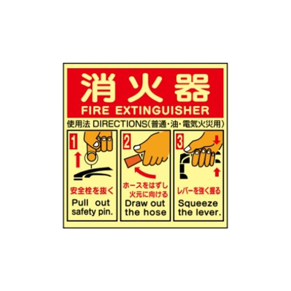 消火器の使用法標識 英文入りタイプ 蓄光ステッカー製 250×260 E162(A)