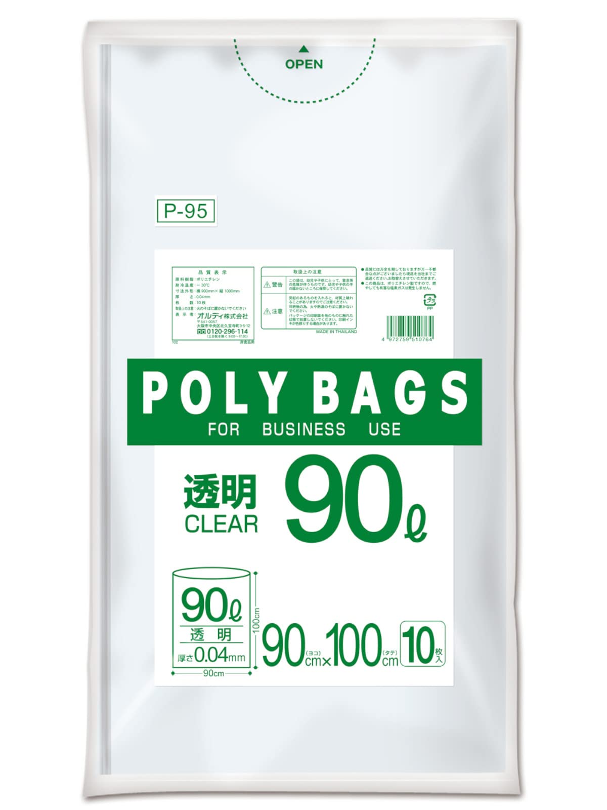 オルディ ごみ袋 90L 厚手 透明 10枚入 縦100cm×横90cm 厚さ0.04mm ポリバッグビジネス P-95