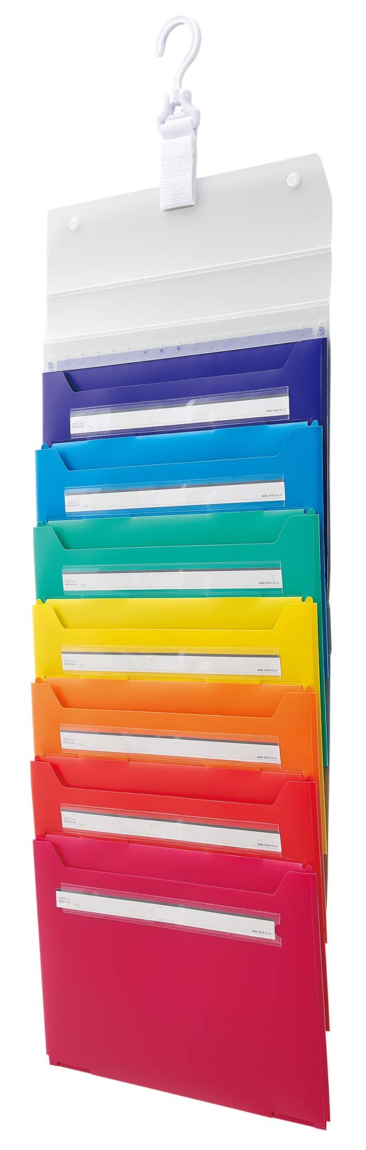 色ごとに分類整理ができる。 壁掛けタイプのドキュメントファイル。 コンパクトに折りたためば、持ち運びにも便利。 7ポケットと4ポケットがあり、用途に応じてご使用いただけます。 書棚等への収納も可能。 着脱式のフックが付属。