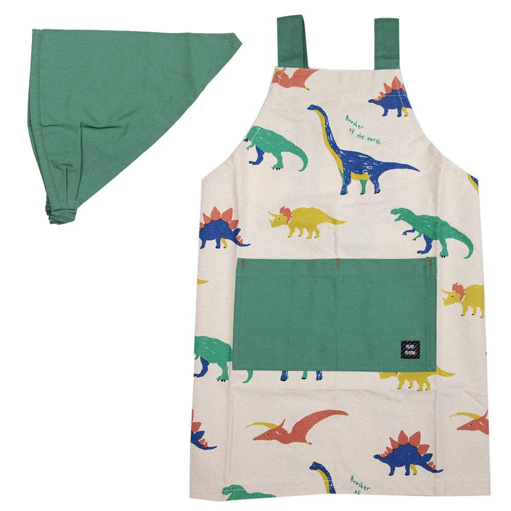 キッズエプロンM ジュラシック ナチュラル 110-120 綿100% おそろいの三角巾付き