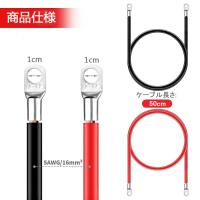 セット内容:長さ 50cm、入数 黒、赤 各1本、バッテリー側ネジ径 8 mm、芯線直径:4.5mm、芯線面積(SQ):16mm2、参考ゲージ数 5AWG、丸型圧着端子:R16-10、許容電流値 100 A。