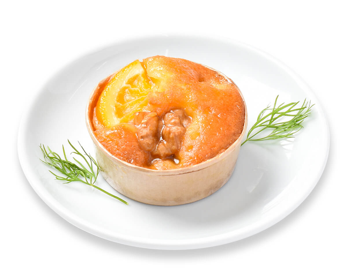 フランス伝統の焼き菓子に、ジャムを塗ったプラム・オレンジ・クルミをトッピング。