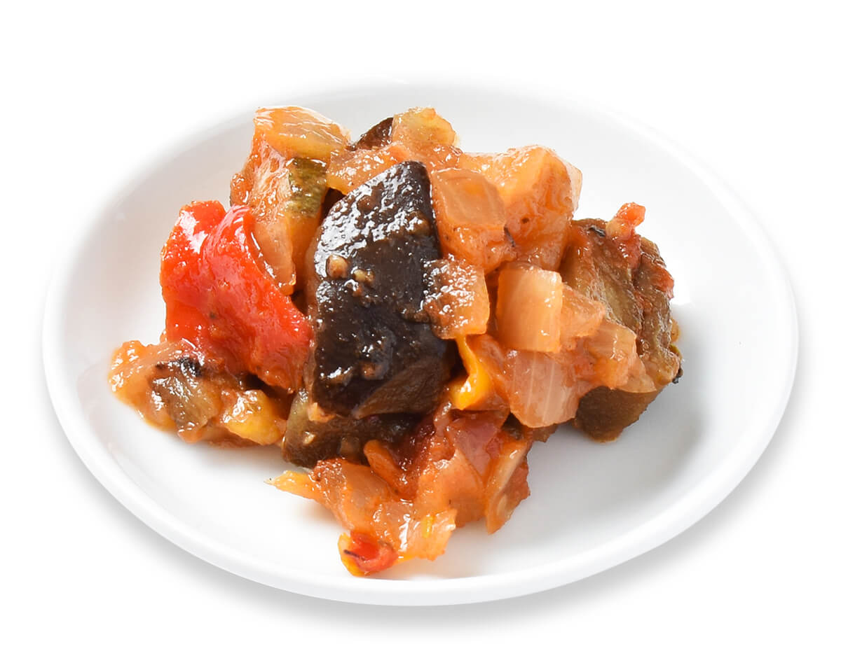トマト、たまねぎ、ズッキーニ、レッドピーマン、イエローピーマン、なす、オリーブオイル、にんにく、塩、ホワイトペッパー、オレガノ、タイム、セイジ、唐辛子