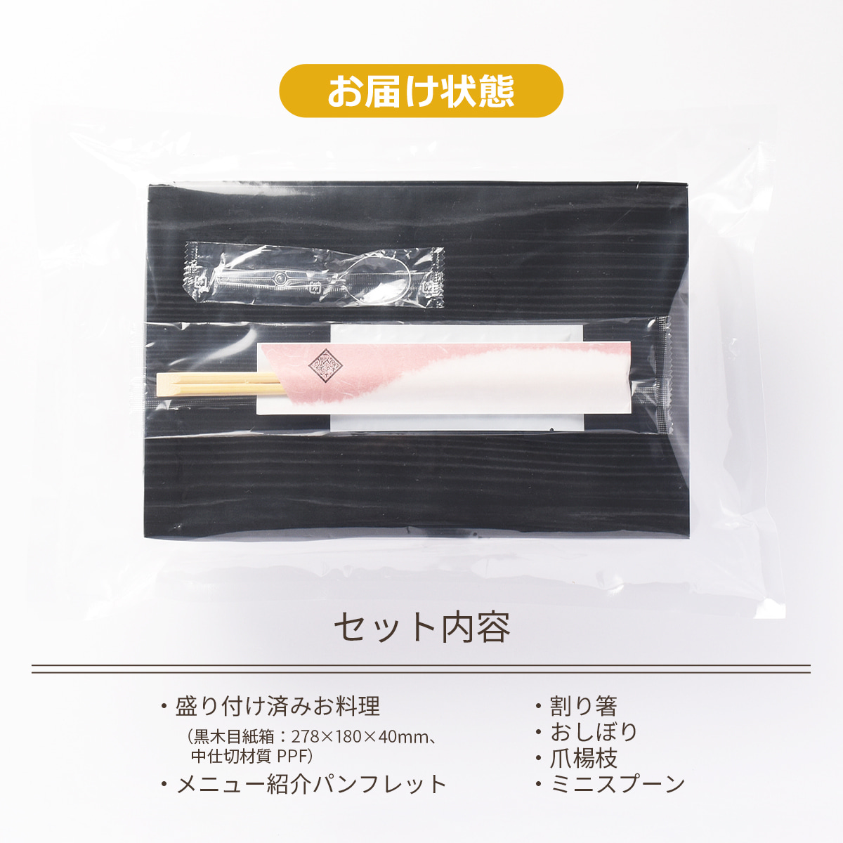 おしぼり・お箸・スプーンもついていて盛り付け済みなので解凍するだけですぐにお召し上がりいただけます。