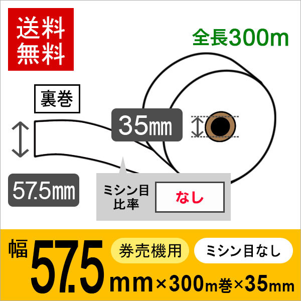 | サイズ | 紙幅57.5mm 長さ300m 紙管内径35mm 裏巻(57.5×300×35) |