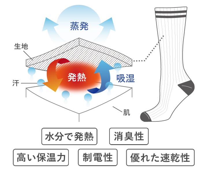 | 濡れると発熱※温度をキープしつつ汗は逃がす。 理想的な登山ソックスが完成しました! 水分を吸収すると発熱する糸を使ったラインナップ「アルファサーモ」の第1弾! 寒い時季の登山・トレッキングに特にオススメのトレイルソックスを開発しました。 ※「身体から発散する蒸気を吸収して発熱する」を意味します。 足を暖めつつ湿気を逃がす糸「ホットハウス」がポイント 表糸に使われているのは「ホットハウス」。人間の体から自然と出ている蒸気に反応し、発熱します。その熱を逃がさない保温性も抜群。 また糸に含まれるウールのおかげで高い速乾性があり、肌をドライに保ちます。制電性や消臭性も併せ持つので、フィールドでの強い味方になるでしょう。 ![]() ![]()