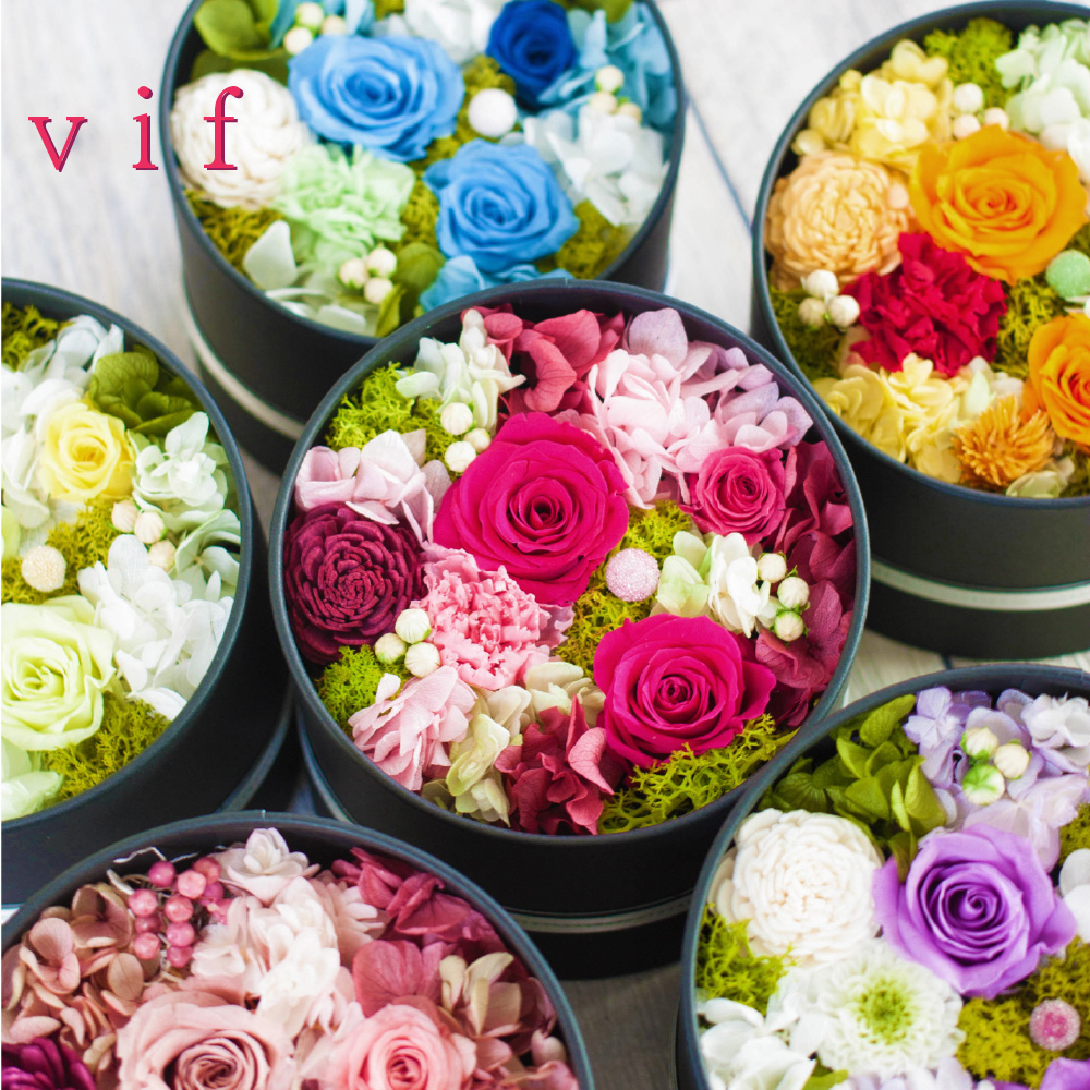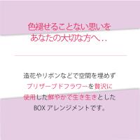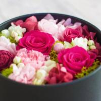 | 使用花材 | ・プリザーブドフラワー : ローズ、アジサイ、カーネーション(パッションピンク・ファインオレンジ・フレッシュブルーのみ)、小菊(ピースパープル・ブライトグリーンのみ)、デイジー(オールドローズのみ)、千日紅(オールドローズのみ) ・装飾品 : ソーラーローズ、アイランドモス、マーブルピック、リボン ※使用花材は季節や仕入れ状況により多少異なる場合がございますことをご了承ください。商品のイメージが著しく変わることはありませんのでご安心ください。 |