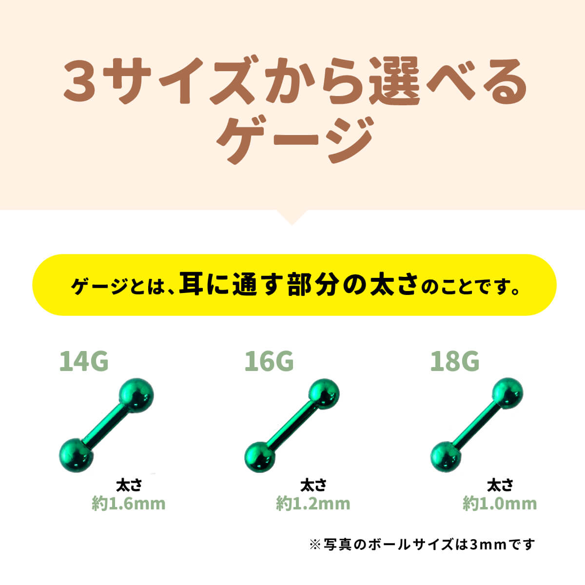 太さ14G,16G,18G シャフト6mm?8mm ボール3mm?4nnのストレートバーベルです。