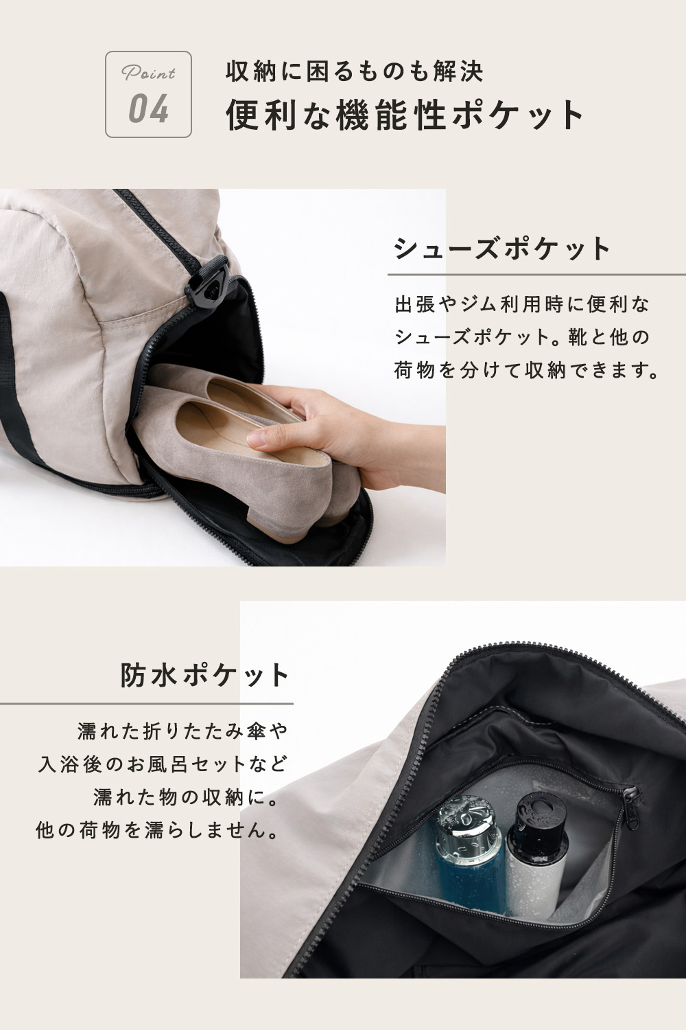 シューズポケットは、出張やジム利用時に特に便利。
