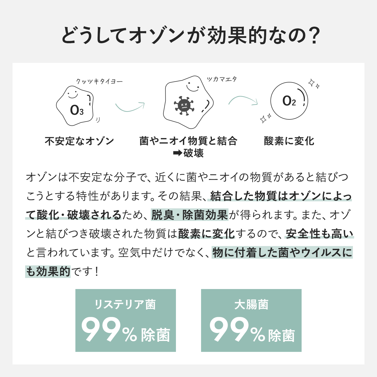 オゾンは不安定な分子で、近くに菌やニオイの物質があると結びつこうとする特性があります。