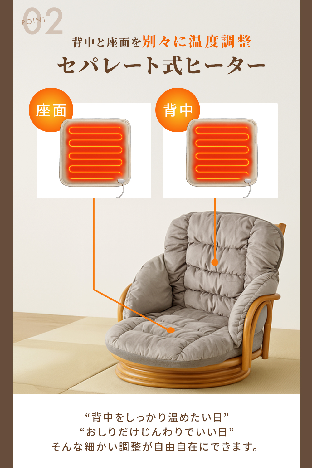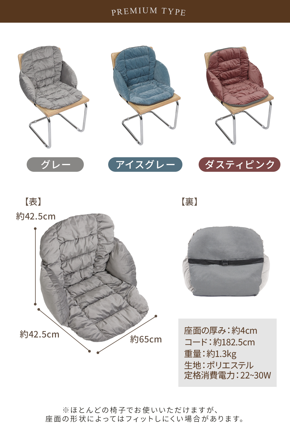 【プレミアムタイプ】包み込まれるようなふかふかクッション プレミアムタイプは、クッション性の高い厚みが特長。 長く座っていてもおしりが痛くなりにくく、リラックスして過ごせる優しい感触です。 背中と座面のヒーターが“別々”に温度調整できるから、好みのあたたかさに細かく合わせられます。 リビングでのくつろぎ時間や、ソファや座椅子の上でも使いやすく、 「しっかり包まれるあたたかさが欲しい」方にぴったりのタイプです。