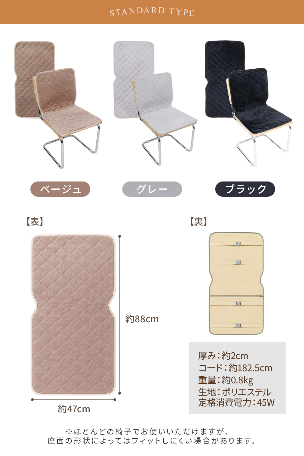 【スタンダードタイプ】すっきり使えるスリム設計 スタンダードタイプは、薄手で扱いやすいスリムなシートタイプ。 椅子に敷いても厚みが出にくく、座面の高さを変えたくない方にぴったりです。 やわらかなキルティング生地で座り心地もよく、背中から腰、おしりまでふんわりあたためます。 シンプルなつくりで、ダイニングチェア・オフィスチェア・学習椅子など様々なチェアにフィット。 「まずは手軽に使ってみたい」という方にもおすすめです。