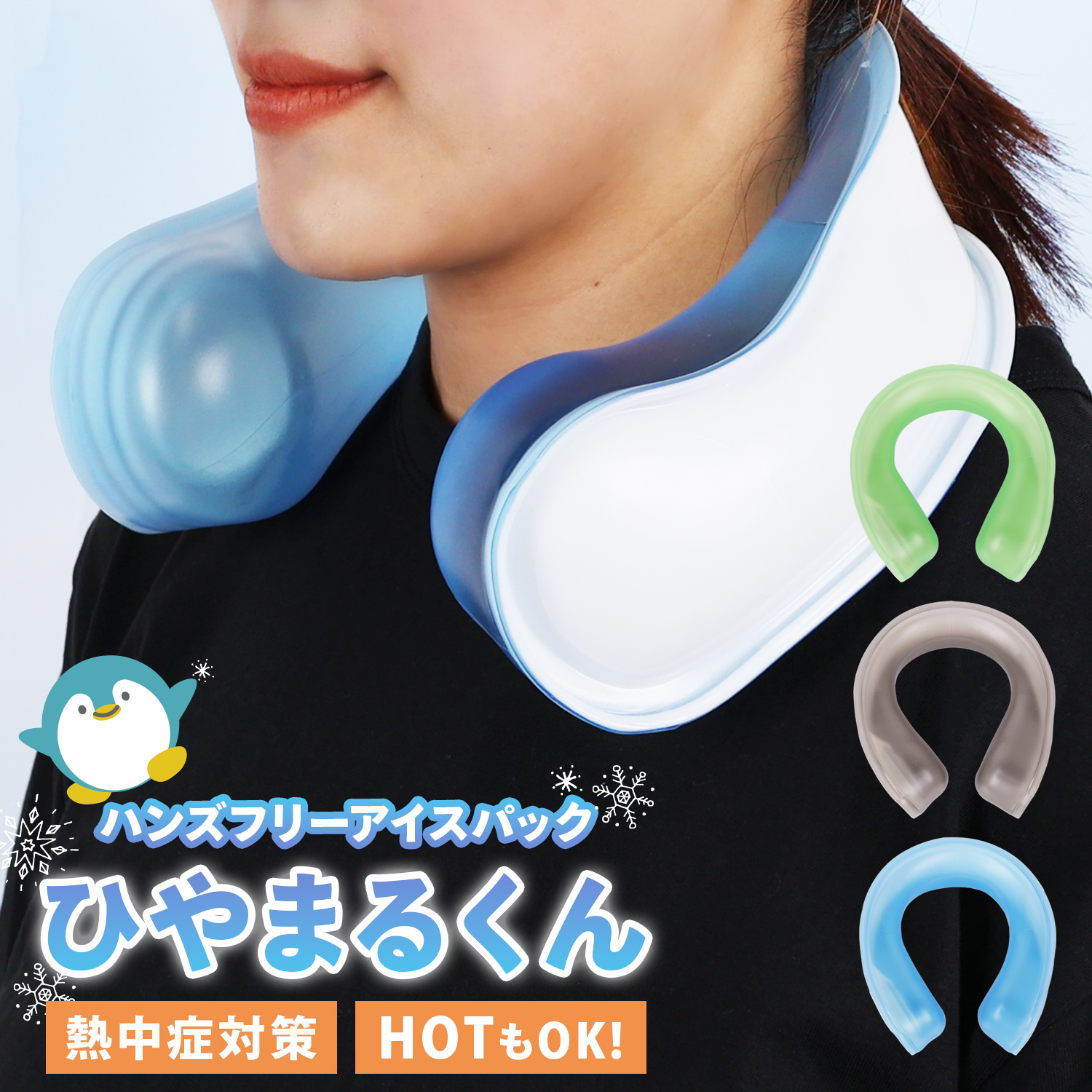 特徴的なU型で、首にかけてハンズフリーで使える氷のうです!