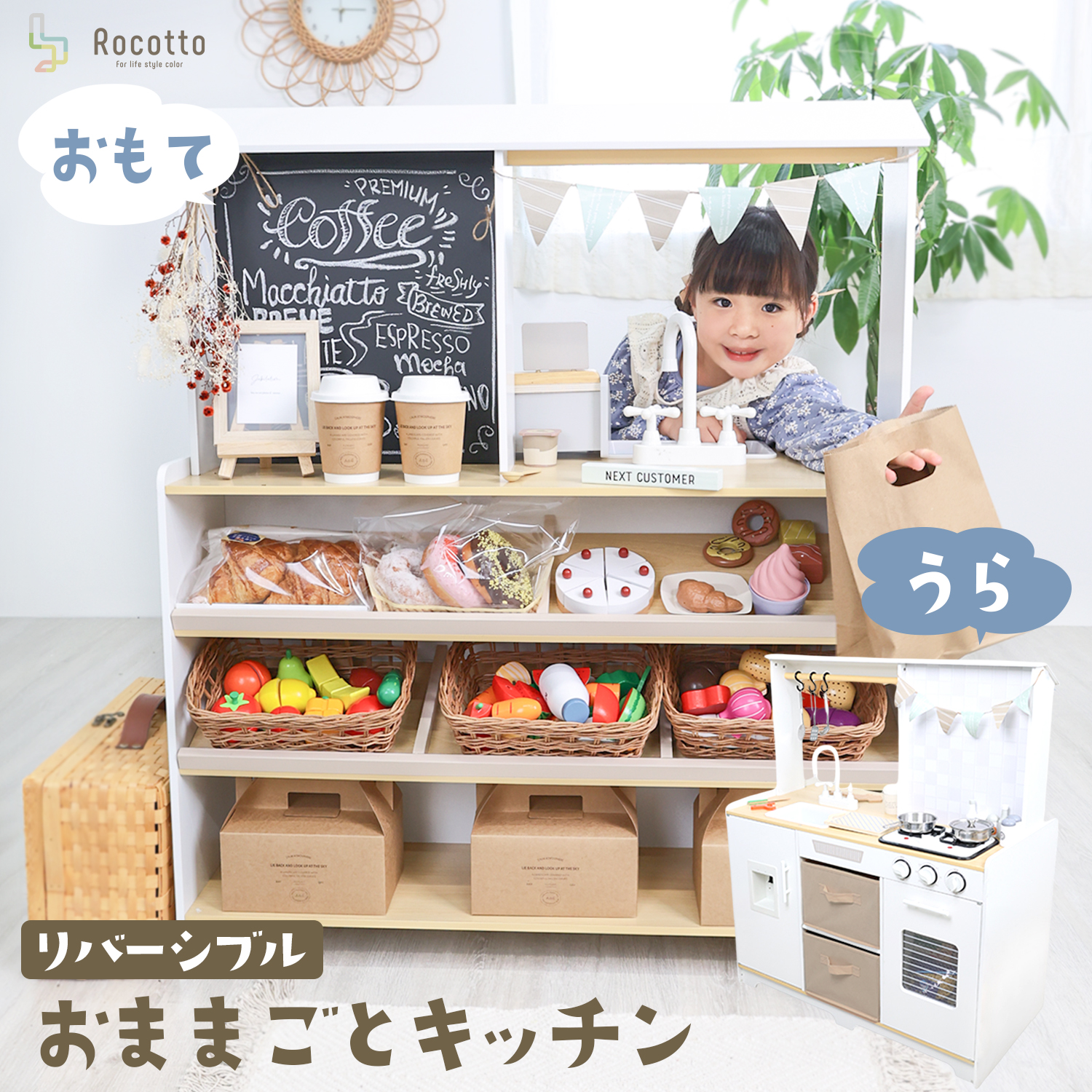 くるっと変えて毎日違うごっこ遊び♪ 片面は「お店屋さん」、もう片面は「キッチン」。 ひとつで2つの遊びが楽しめるおままごとキッチンです。 毎日違ったごっこ遊びができるから、飽きることなく遊べます♪