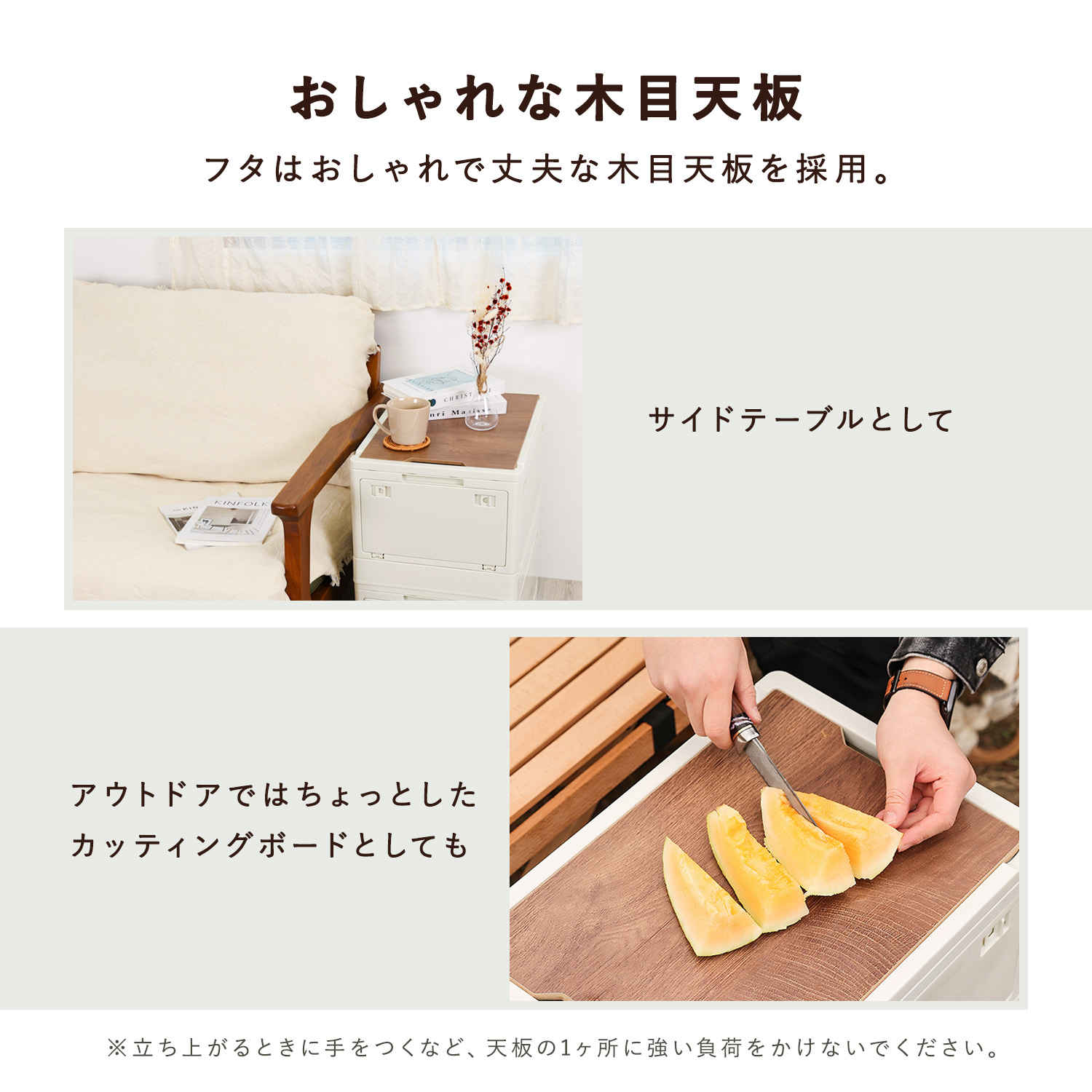 1個ごとの底面の耐荷重は30kg! 50kgまで、スタッキングしたり、物を置くことが可能です。
