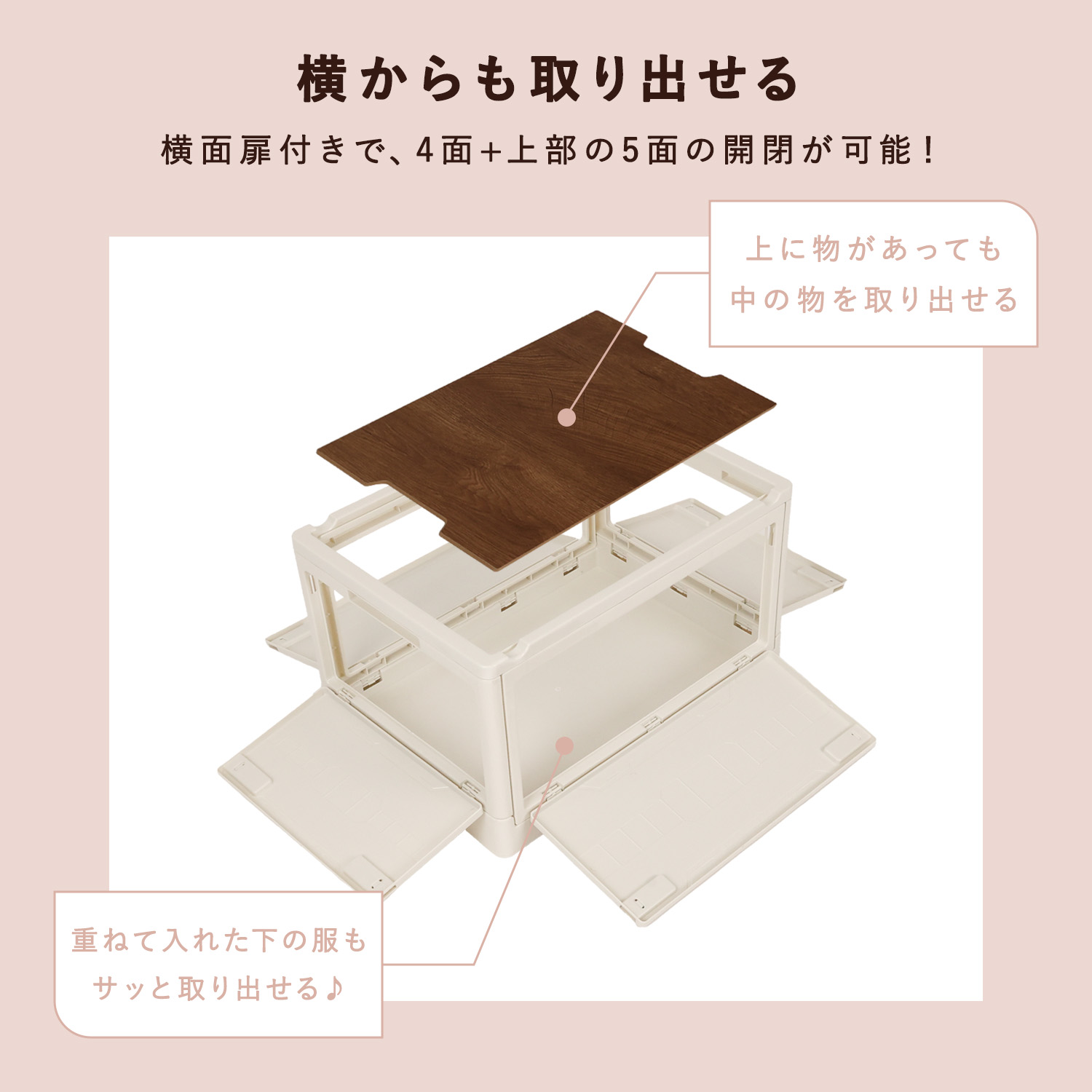 上に物を置いていても横から中の物を取り出せる横面扉付き! しかも、4面+上部の5面の開閉が可能! 重ねて入れた下の服もサッと取り出せる♪