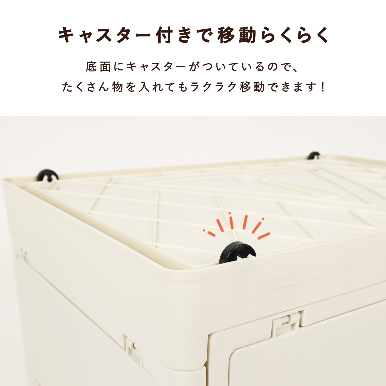 底面にキャスターがついているので、たくさん物を入れてもラクラク移動できます!