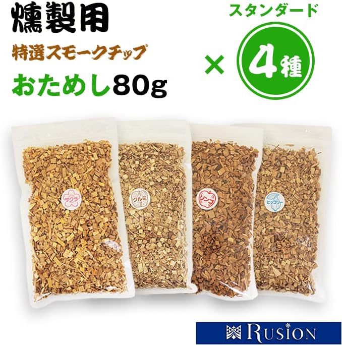 ルシオン こだわりの特選 スモークチップ 燻製 天然木 おためしセット 80g スタンダード4種(サクラ、クルミ、リンゴ、ヒッコリー) アウトドア キャンプ