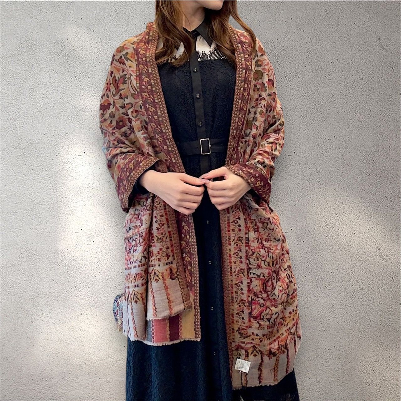 温かみのあるベージュをベースに、ペイズリーと植物モチーフを組み合わせた多色織り。赤やオレンジの差し色が華やかさを添え、身にまとうだけで上品な存在感を演出します。フォーマルなドレススタイルはもちろん、カジュアルコーデや和装の羽織りとしても相性抜群。シンプルな装いのアクセントにもぴったりです。
