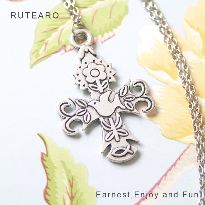 鳥 動物 ネックレス クロス ペンダント ロング レディース 十字架 花 レトロ アンティーク調