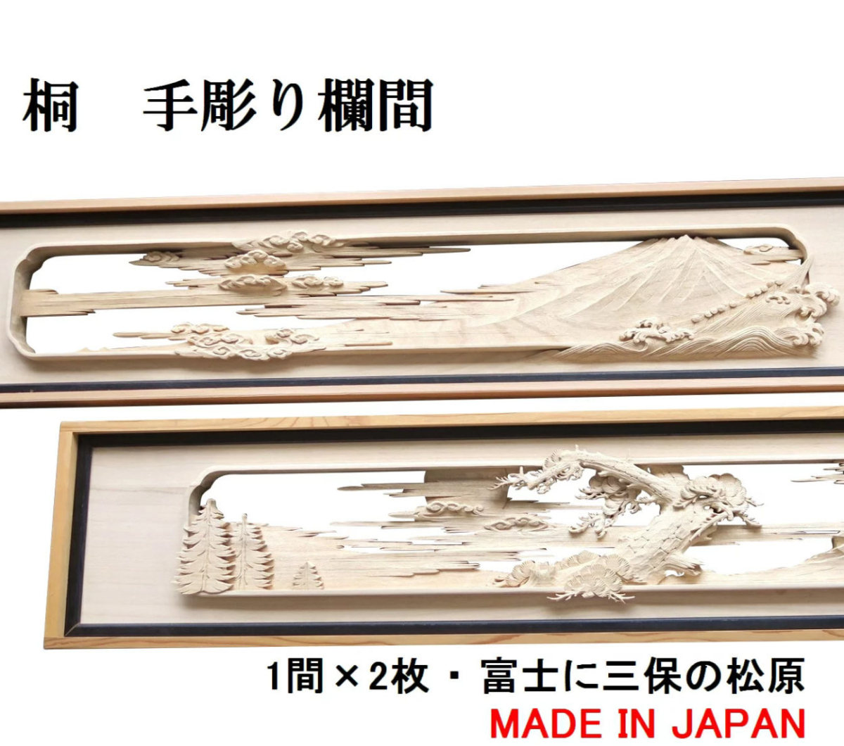 欄間 建具 欄間彫刻 【1点もの商品】【新品】 高級手彫り欄間2間1組(1間×2枚) 彫刻 / 富士に三保の松原 桐 国産材 国内加工