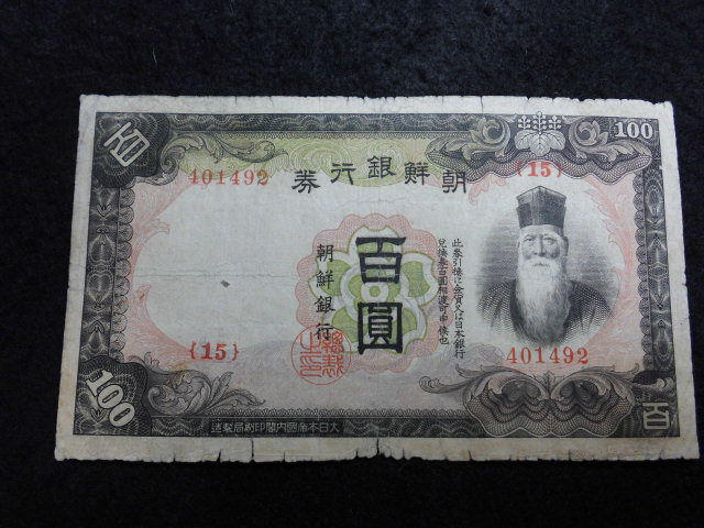発行 昭和13年 大きさ93ミリ×162ミリ 漉 百円、李花、蝙蝠、朝鮮銀行