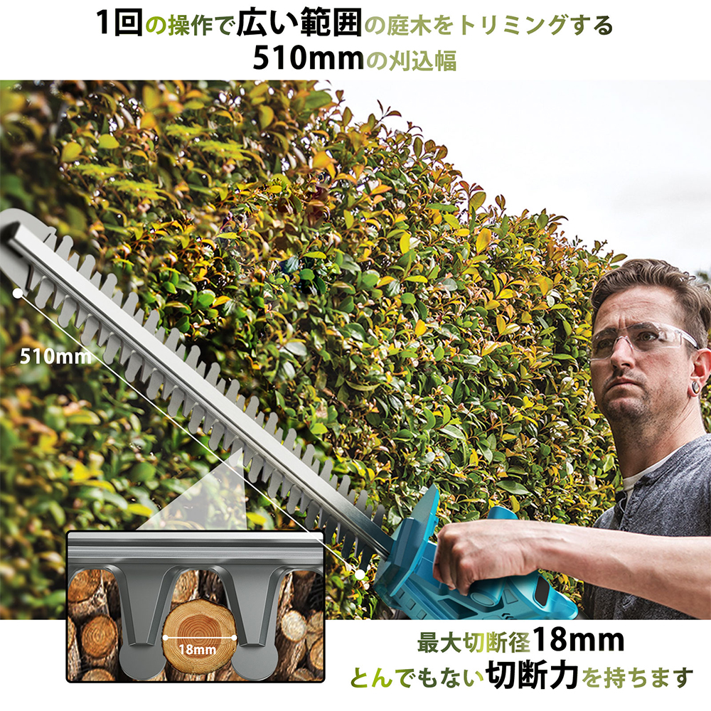 ヘッジトリマー 充電式 電動ヘッジトリマー マキタ18Vバッテリー対応 刈込幅510mm/切断径18mm 両刃駆動 高速往復刈り 電動トリマーコードレス 軽量