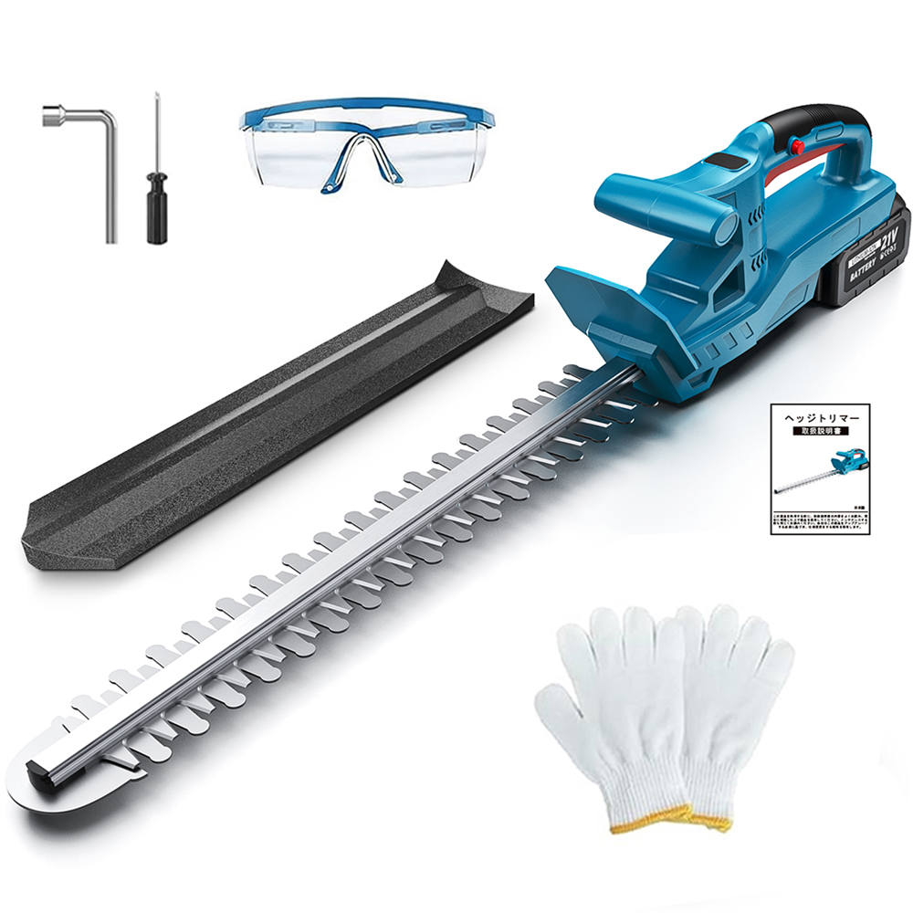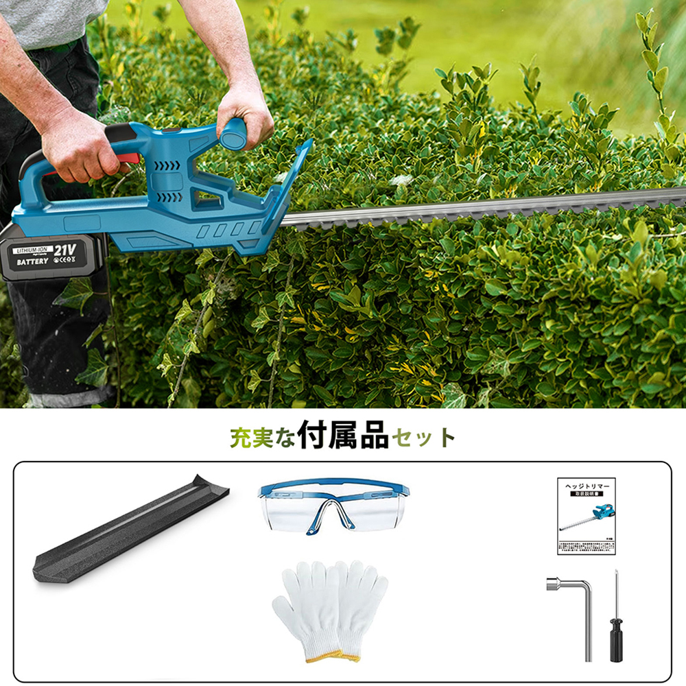 ●付属品:ヘッジトリマー本体、ブレード収納ケースx 1、保護メガネx 1、手袋x 1、ドライバーx 1、レンチx 1、日本語取扱説明書x 1