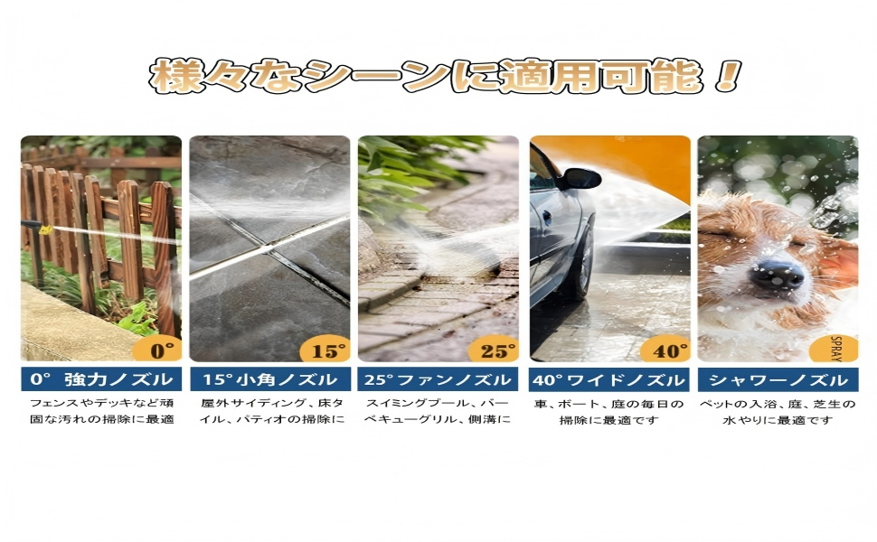 当社の人気高圧洗浄機には一体型の5in1ノズルが配備されており、ノズルを回転させることで簡単に角度を調整し、0°、15°、25°、40° 、拡散モード噴射、シャワーモード噴射5つの異なる噴射モードを切り替えることができます。お掃除に必要なものを総合的にカバー。 植物の水やり、車、ガーデニング用具、バイク、ボート、窓、壁、床、バスルーム、シンク、ドア、車道、駐車場、フェンス、キャンプ用品、バーベキュー、お墓などの掃除に最適です。 コケ、手作業では掃除しにくいコーナーなどにも。 高圧洗浄機には洗車用に設計された泡ボトルも付属しており、濃密できめ細かい泡が瞬時に刺激されてボディワークを均一に覆い、窓やドアの汚れを目立たなくし、洗車体験をアップグレードしてプロ級の洗浄結果を楽しむことができます。 家庭での洗浄に最適で、1台持っていると便利です。