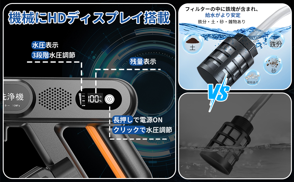 家庭用洗浄機は高性能なブラシレスモーター搭載して、水を素早く吸入・加圧して噴射します。吐出圧力10.0Mpaで噴射される水流により、ガンコな汚れを洗い流す高圧洗浄機です。