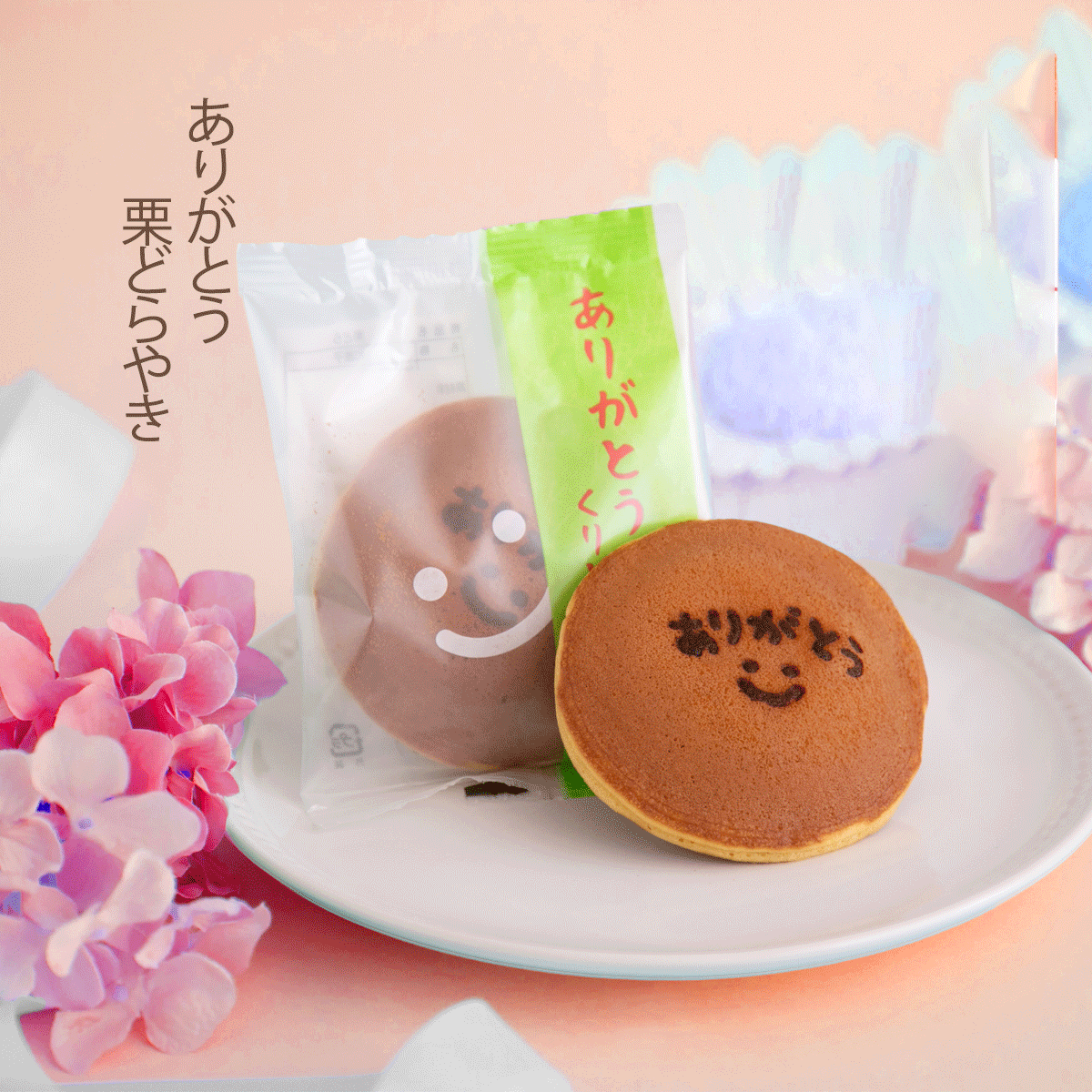 ありがとうの刻印入り 餡の中には栗がたっぷり入った栗どら焼き!感謝の気持ちを伝えるのにピッタリです。