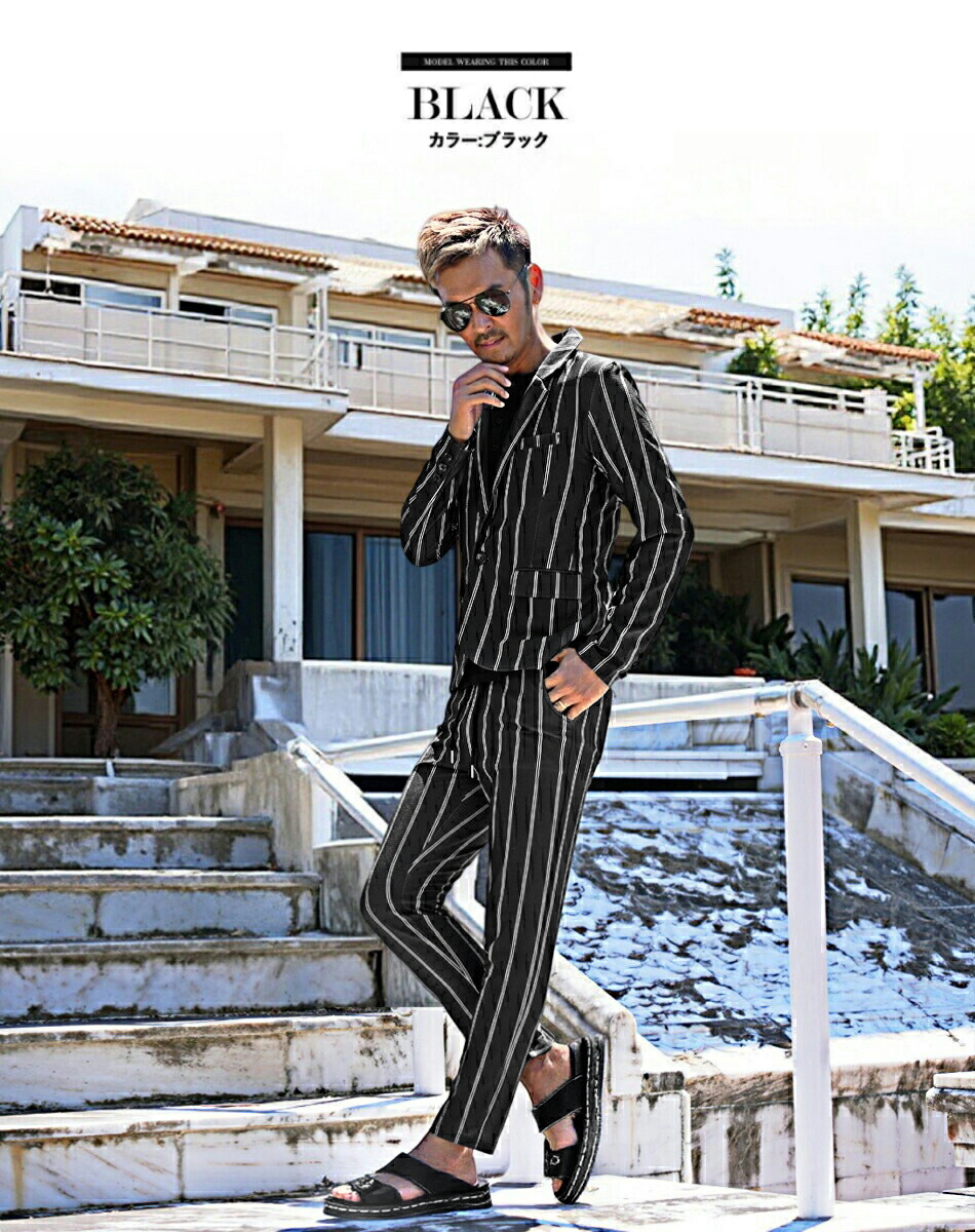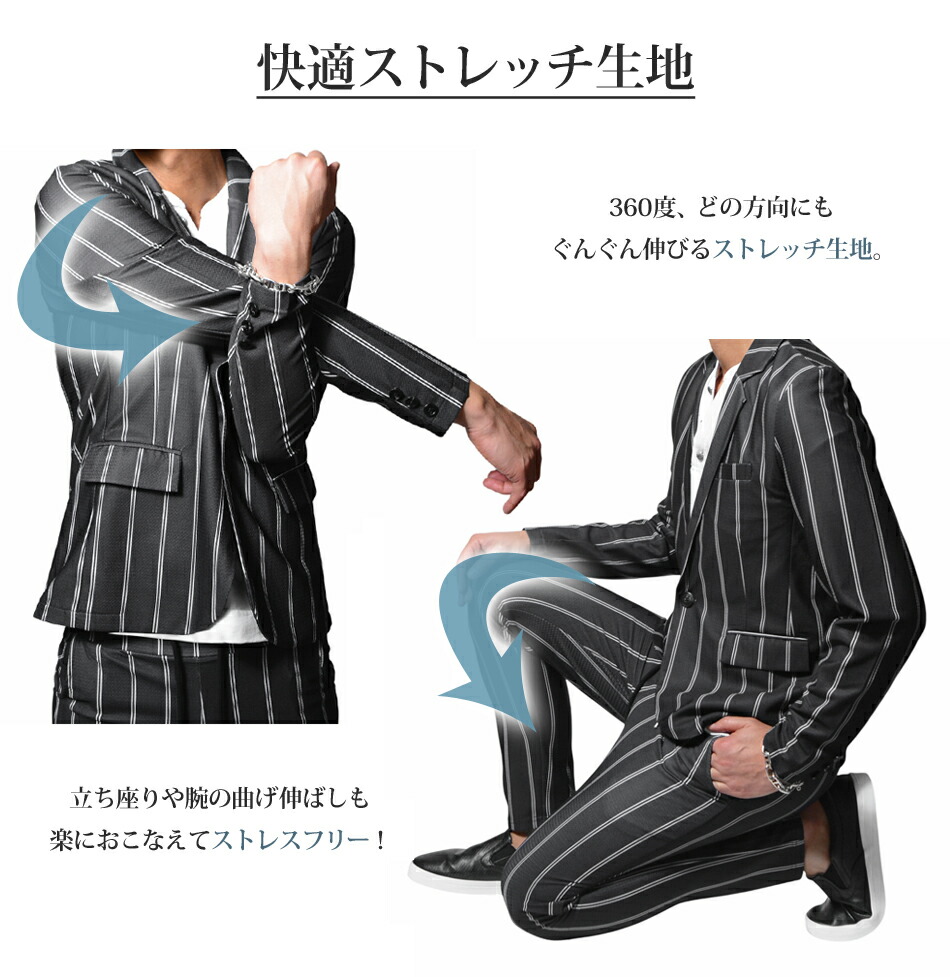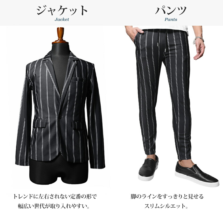 セットアップ メンズ カジュアル スーツ メンズスーツ ストレッチ ストライプスーツ スリム 細身 スキニー 美脚 ネイビー 黒 白 ジャケット おしゃれ お洒落 オシャレ カジュアル テーラードジャケット 伸縮 成人式 二次会 卒業式 1万円台 きれいめ スラックス イージーパンツ 上 下 M L LL XL ユニセックス レディース 男性 男 服 春 夏 秋 メンズファッション 20代 30代 40代 50代 60代 オフィスカジュアル 結婚式 パーティー 父の日 プレゼント