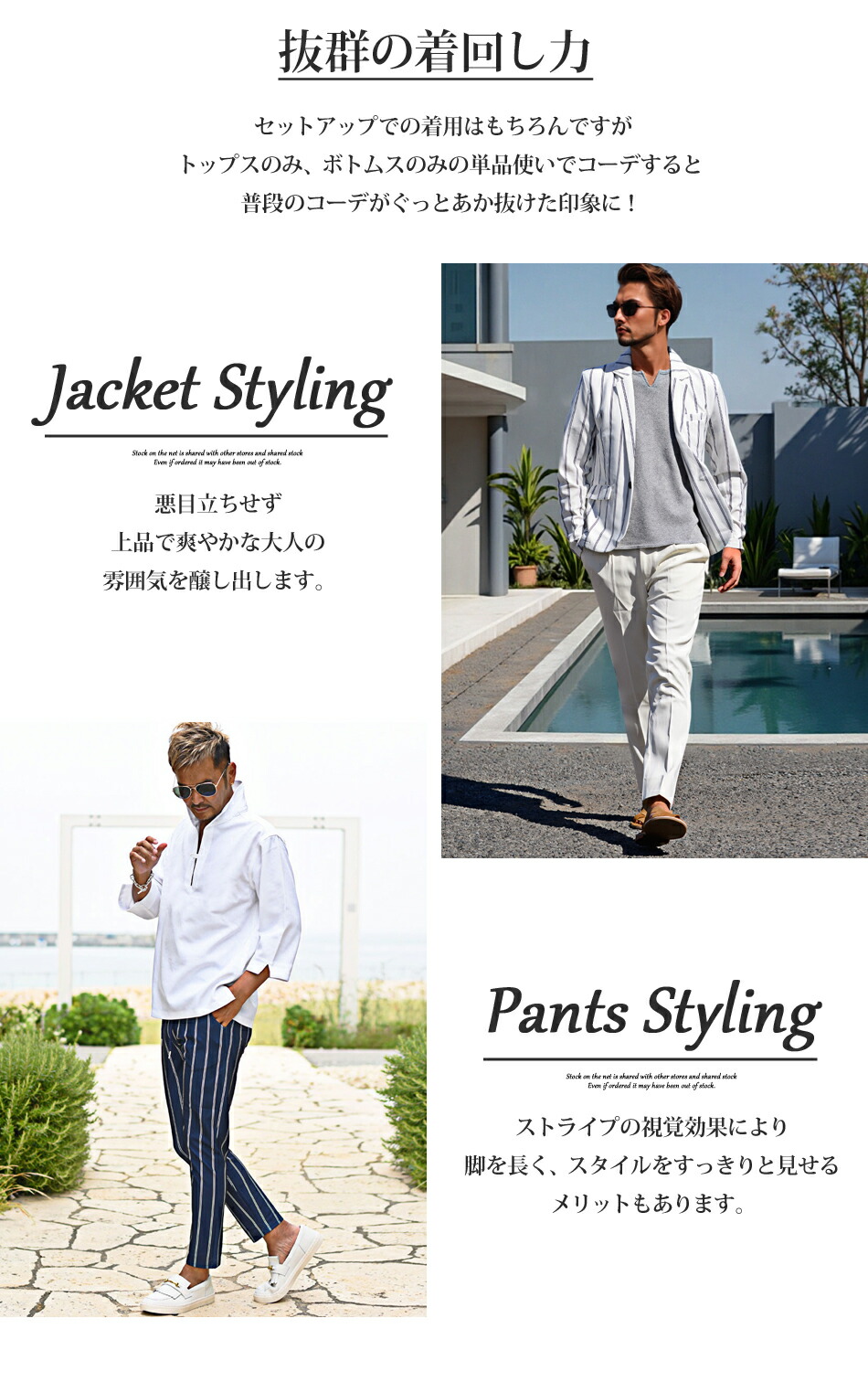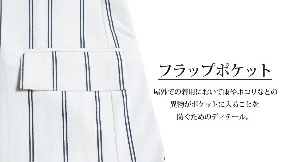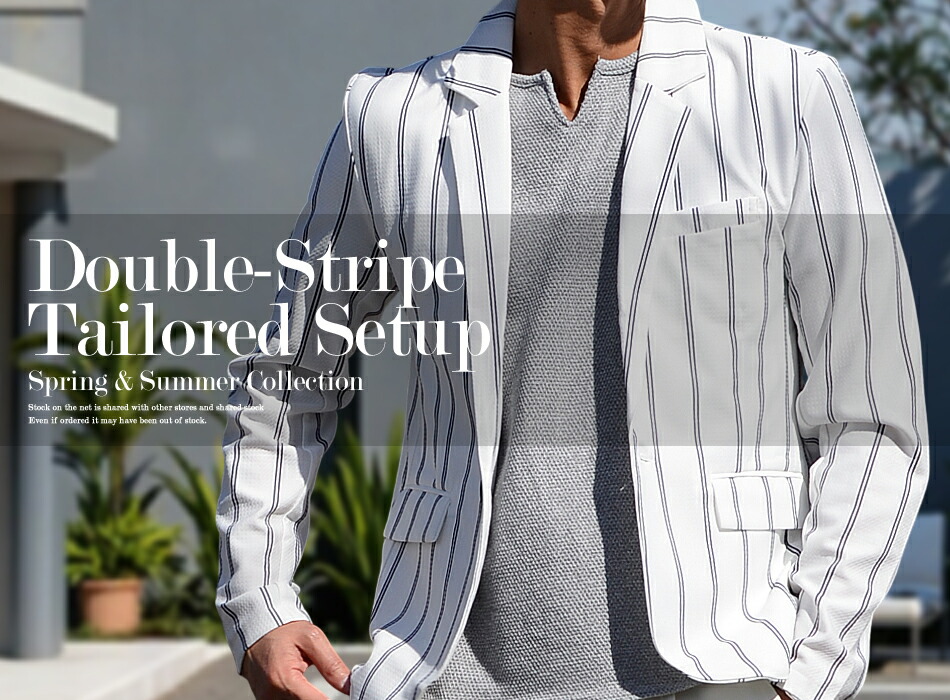 ふんわり軽くラフに着用できる、着心地の良いストレッチ素材のダブルストライプ柄テーラードセットアップ。