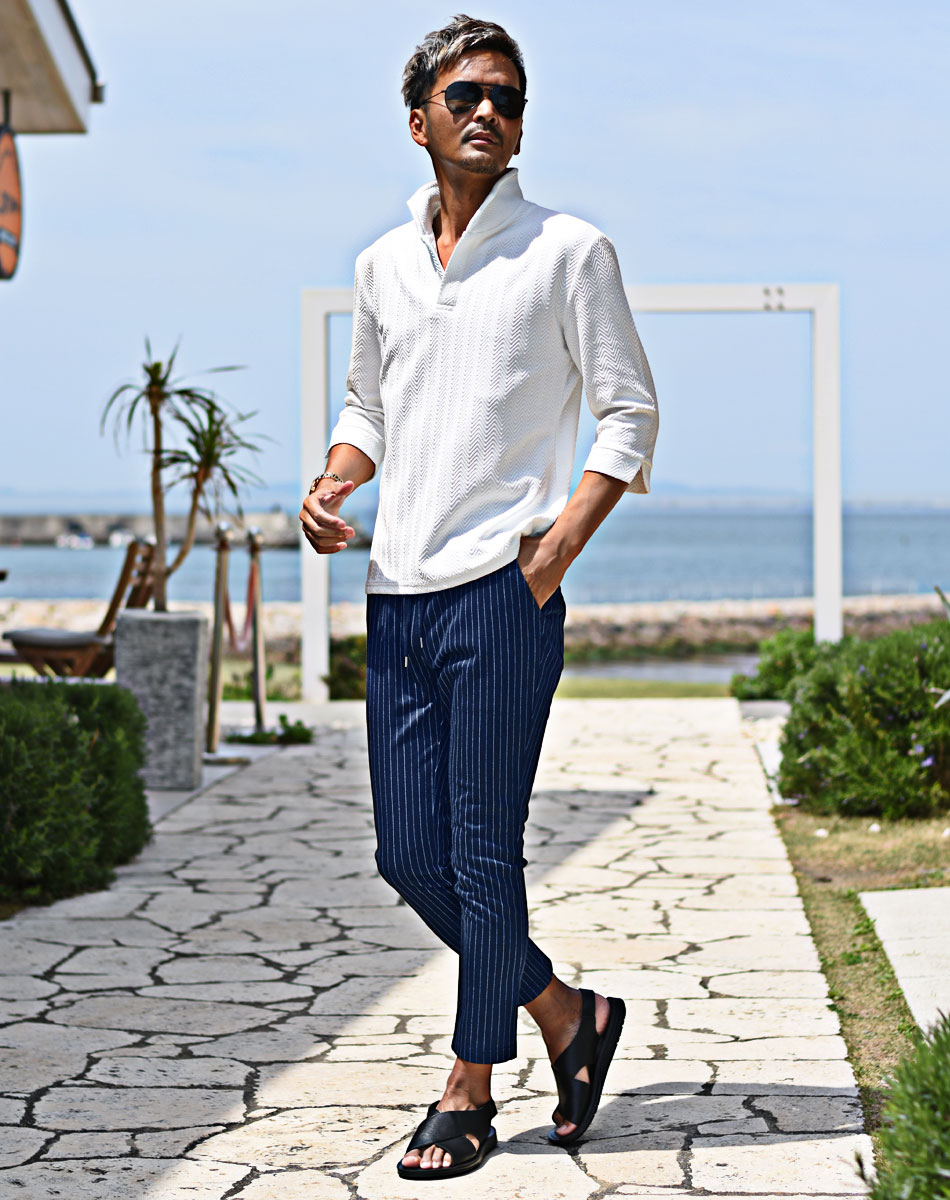 伸縮性があってラフに着用できる、楽ちんなカット素材ストライプセットアップ。