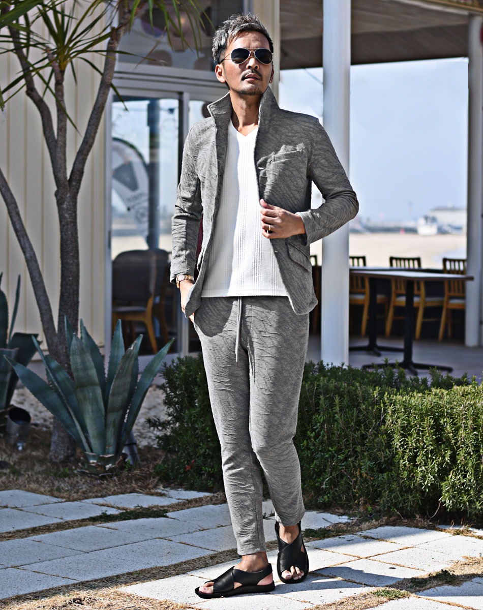 表情豊かな斜め膨れの生地感がスタイリッシュなイタリアン襟ジャケットセットアップ。