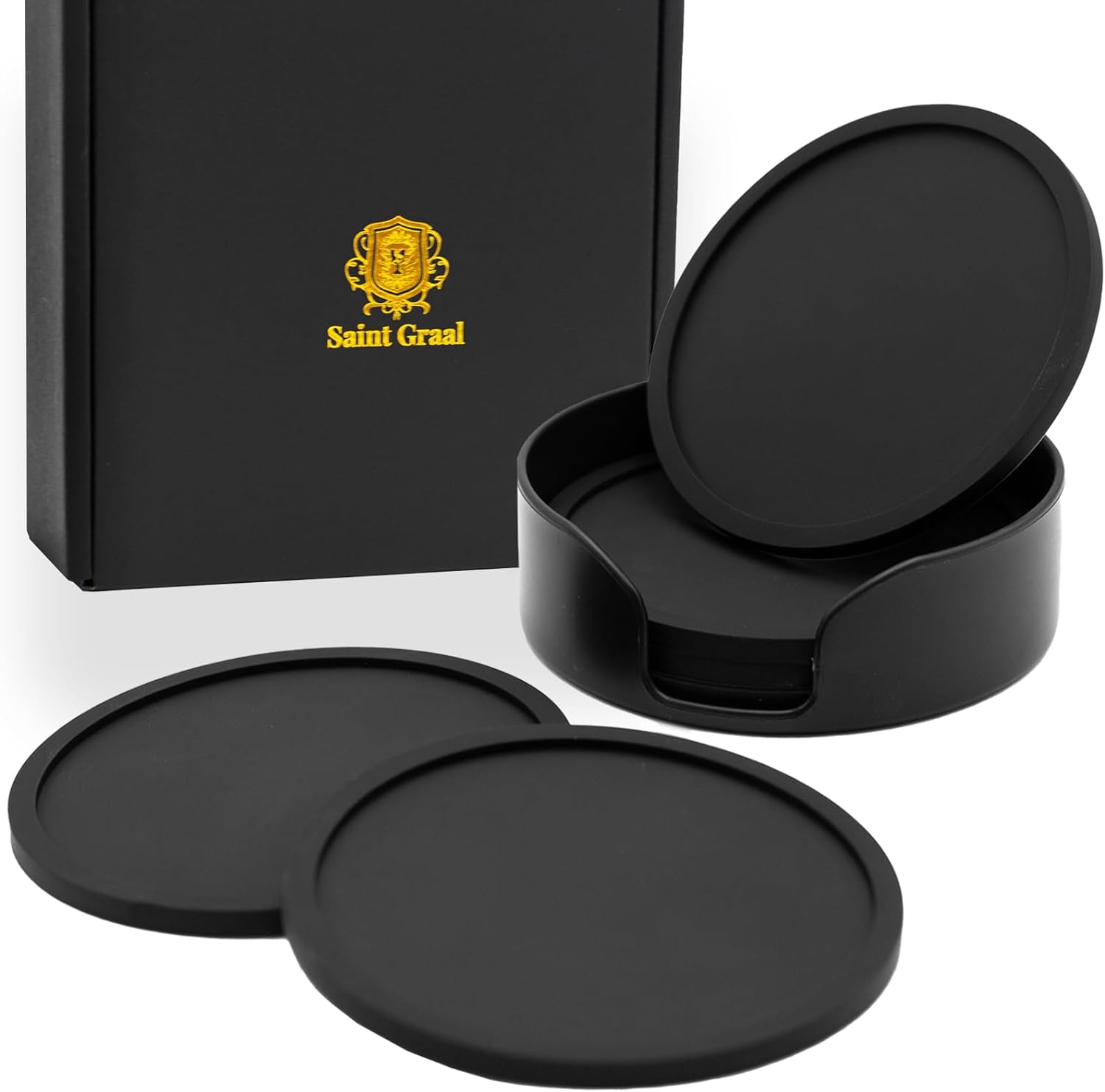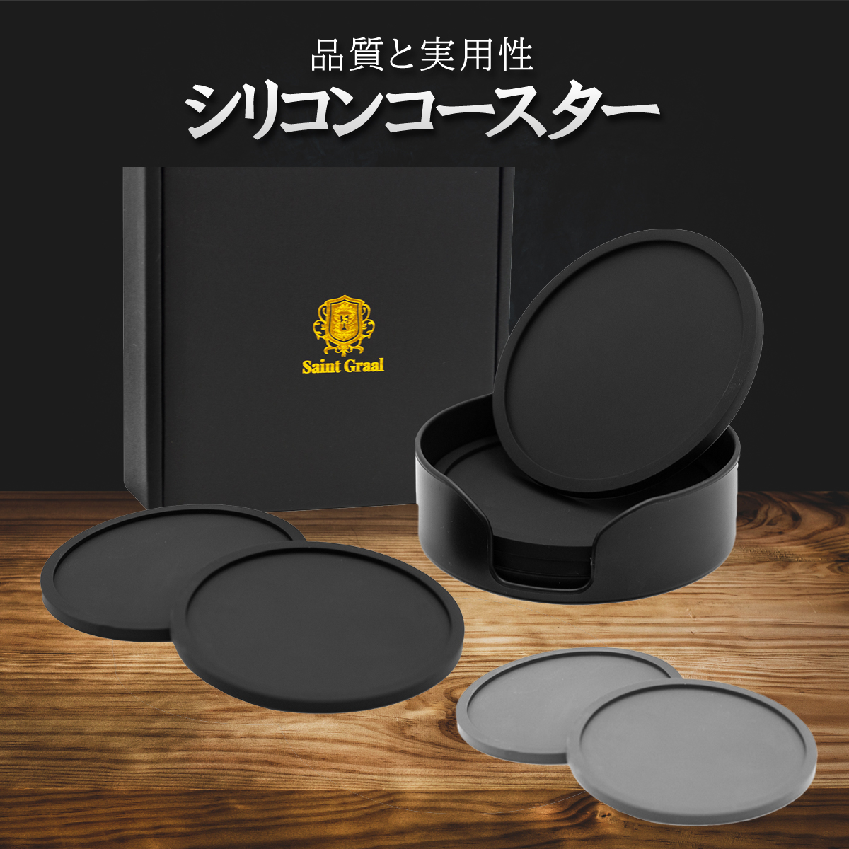 【立体構造で水滴をキャッチ】 シンプルで使いやすく、おしゃれなデザインの セイントグレイル の シリコンコースター。縁のある立体的な作りのため、コップの水滴などがテーブルにこぼれるのを防ぎます。洗練された黒の色合いは、どんなインテリアにも調和し、高級感を演出します。シリコン素材は耐久性があり、熱や水に強く、長く使用できます。