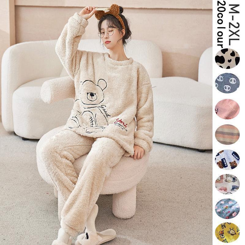 パジャマ モコモコルームウェア レディース 冬 長袖 パジャマ 丸首 フランネルルームウェア 暖かい 上下セット 可愛い 厚手 部屋着 ゆったり韓国風