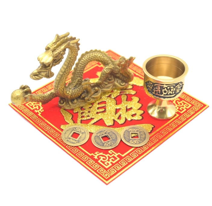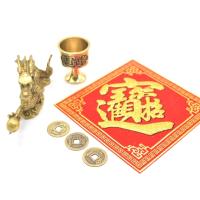 龍の銅製置物と古銭三枚、敷物用の福飾り、銅杯一個がセットになった商品です。