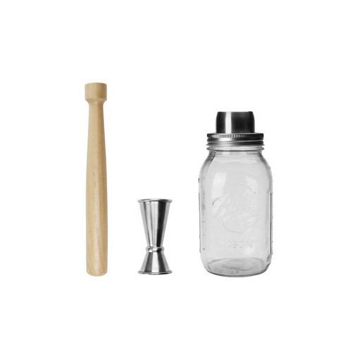 THE MASON SHAKERは、940mlのボールメイソンジャーとステンレス製の「ストレーナー」、「トップ」の3つのパーツとステンレスジガー・ウッドマドラーのセットです。