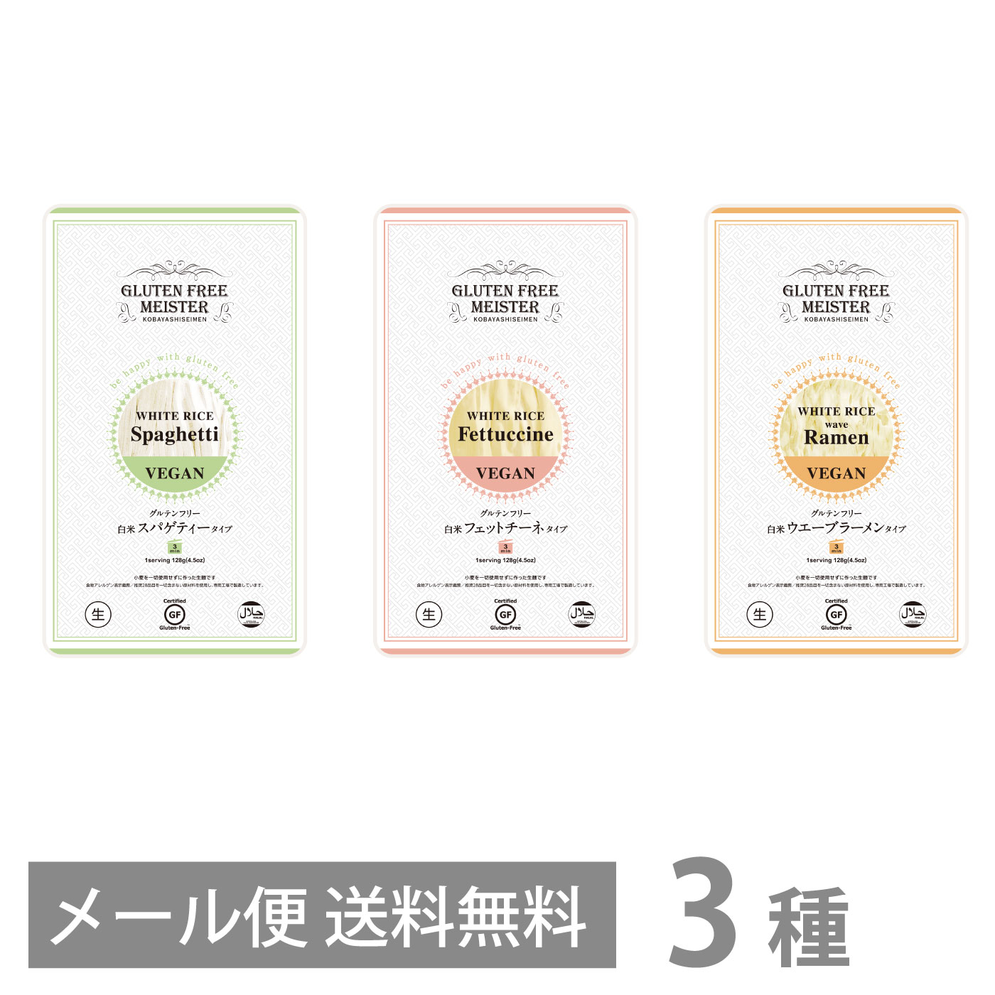 グルテンフリー 生麺 お試し3種セット《白米》人気のフェットチーネ・スパゲッティ・ラーメンウェーブの3種セット(A) メール便 送料無料 米粉麺 国産