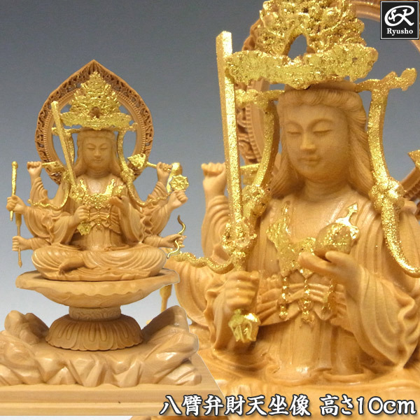 木彫り 仏像 金彩八臂弁財天 坐像 高さ10cm 柘植製 弁才天