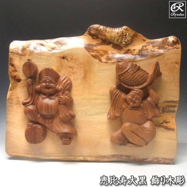 弊社がこだわりをもって作製した恵比寿大黒の飾り木彫です。恵比寿と大黒天は欅(けやき)材を使用。存在感があり、映えるように仕上げております。板の部分には天然木の風合いを活かした控え目な栃(とち)材を使用しています。裏面にはチェーンを取り付け壁掛けとして使用して頂けます。また皿立てなどに立てかけて飾られるのも良いかもしれません。