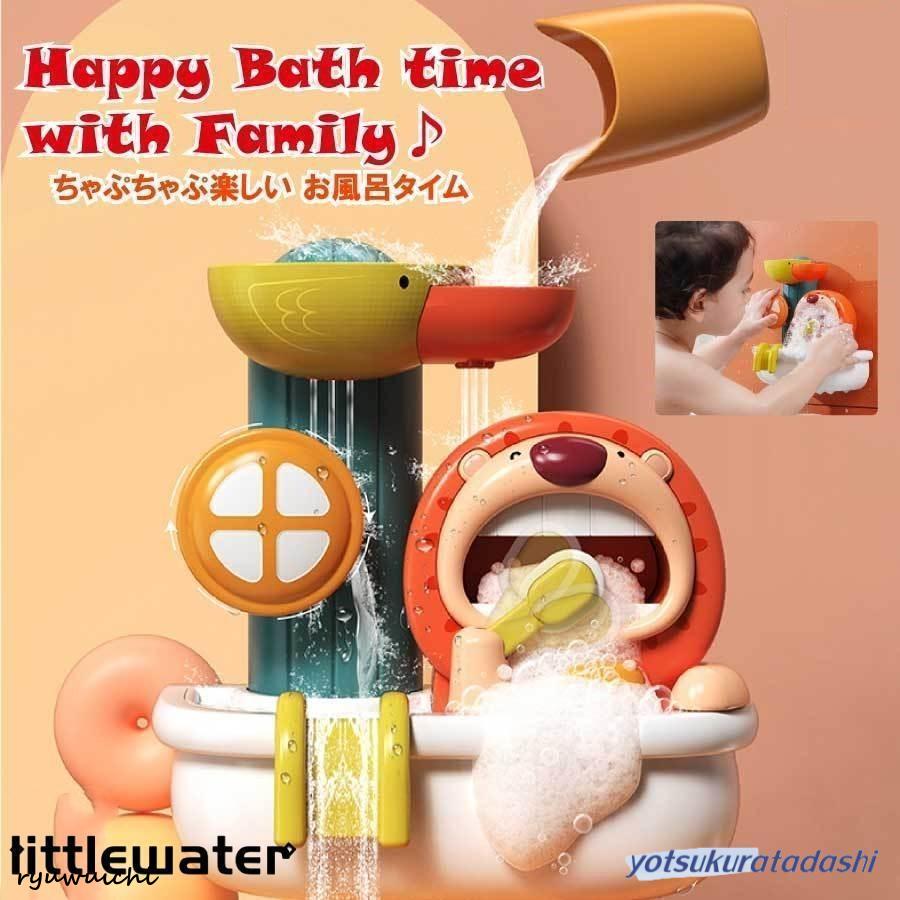 「可愛いデザイン」子供はシャワーカップに水を注ぐことでシャワーを浴びることができます。歯車は水の流れの中で回転し、小さな水車がくるくるまわり,水がライオンの口に流れます。ライオンの頭の上にボディーソープを入れ、ライオンの口の下のボタンを押すと、ライオンが歯磨きをします。水の重力に頼って運転し、 内部の巧妙なリンケージ構造を通して、一連の興味深く科学的なプロセスが完了し、子供たちの思考能力を活性化します。