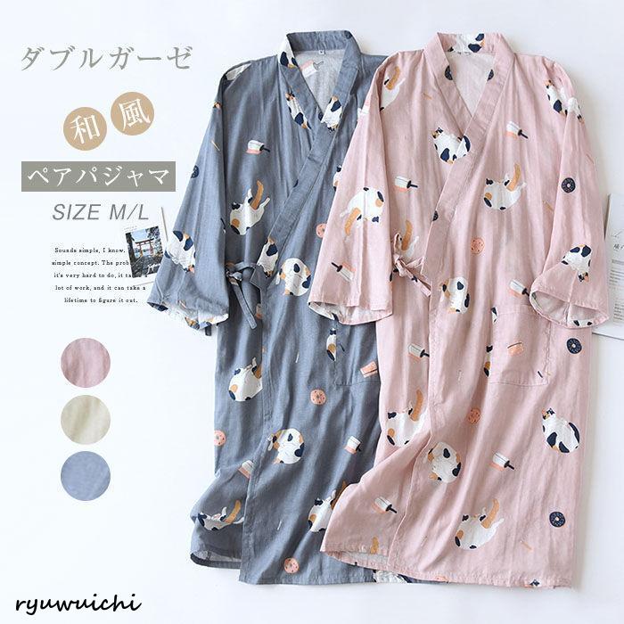 ダブルガーゼ パジャマ 浴衣 バスローブ ペアパジャマ レディース メンズ 春 夏 七分袖 ルームワンピース 寝巻き 綿100% 甚平 浴衣 猫柄 和風パジャマ カップル