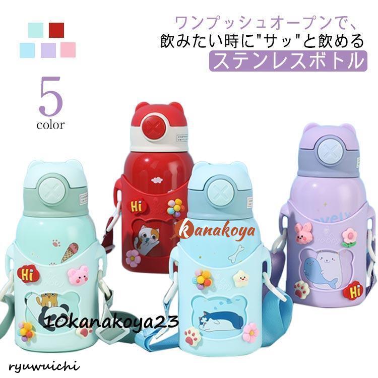 水筒 子供 キッズ 直飲み ストロー ワンタッチ 2way コップ ステンレス 保冷 保温 カバー付き ショルダー ひも 洗いやすい 広口 遠足